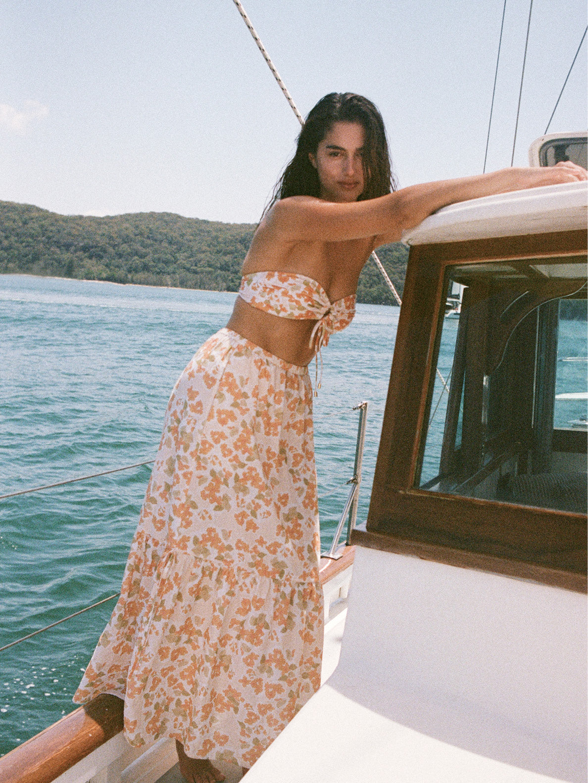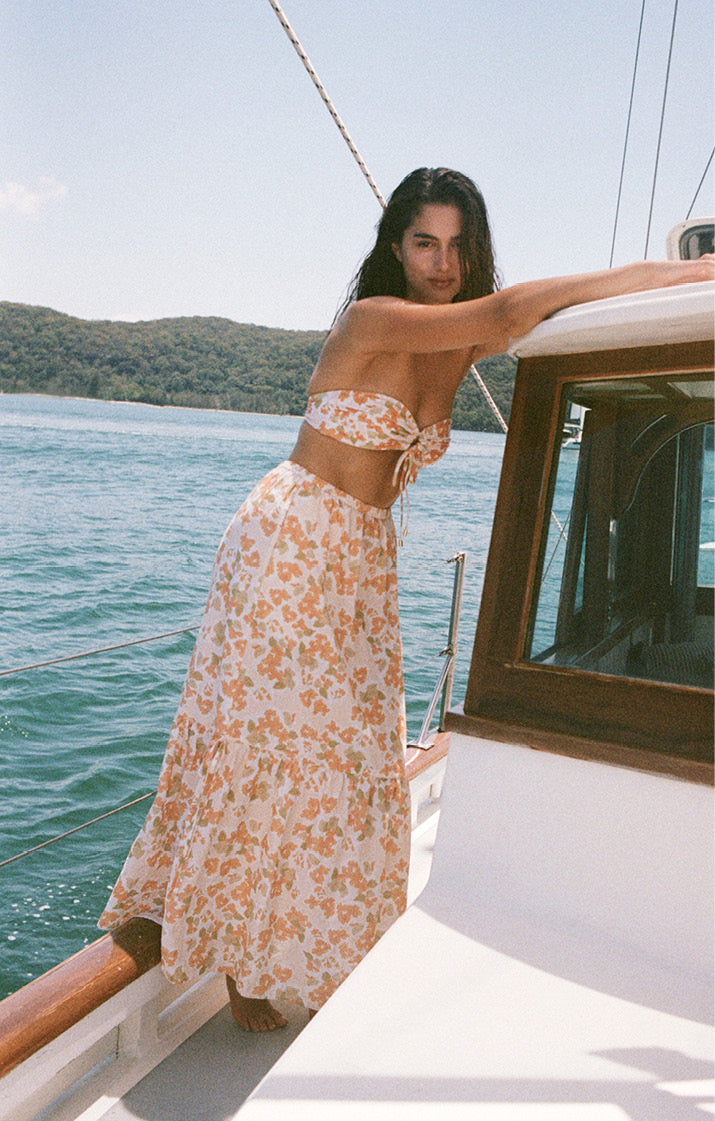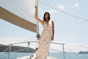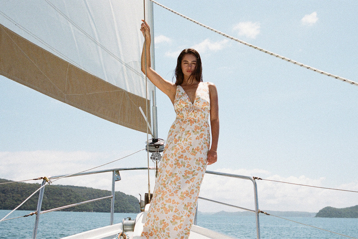 Embodying the luminosity of sun sparkling across rippling water, the collection is built upon a sun-soaked colour palette of glistening melon, soft rose and vintage cream. Hand-painted watercolour florals breathe life into new silhouettes and sing against the backdrop of natural landscapes and endless ocean.