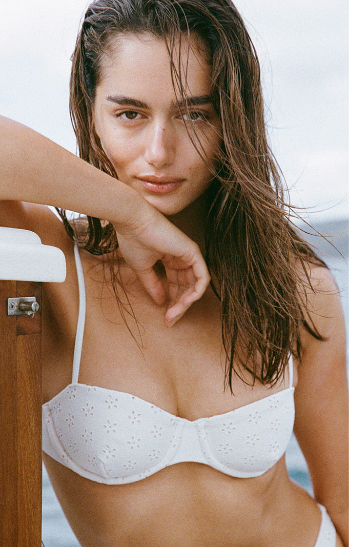 Designed to be worn by the water, each and every swimwear piece is made from recycled content. Our custom Fleur embroidered fabric is developed in house and made from REPREVE® regenerated fibres. Understated and elegant, embroidered floral motifs decorate modern shapes for a selection of timeless swim that balances luxury and sustainability.