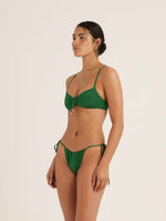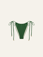 Our Ruched Channel String Pant arrives in Bottle Green, offering skimpy coverage for sun — drenched days. This style is fully adjustable, so you can customize the fit and coverage to suit you. Pair it with the matching Solstice Crop for a modern holiday swimsuit.